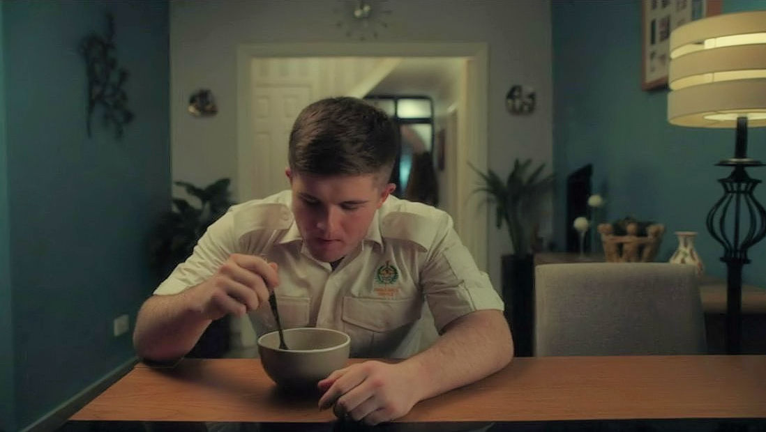 Jason Doyle (Karl Rice) eating what seems to be a bowl of noodles. He will shortly be kidnapped and held hostage to persuade his father to assist in the Kinsellas’ heist. He’s watcfhing a variety program on TV and we hear two names mentioned by the announcer: Victor Bayda, an Irish language officer in a Kerry Gaeltacht, and actor Demi Isaac Oviawe,