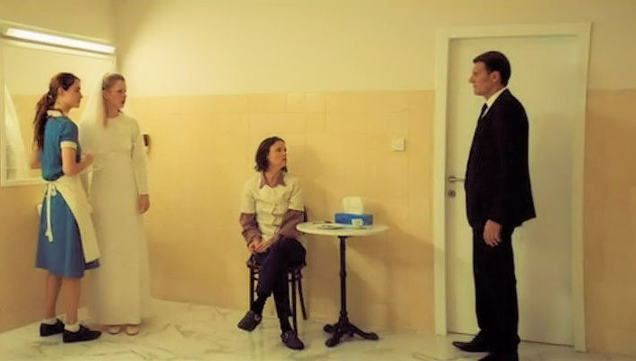 Ana, the unnamed Bride-to-be, a washroom attendant, and the evil headwaiter, just before Ana’s departure. Everyone in this image is present in both of Ana’s universes.