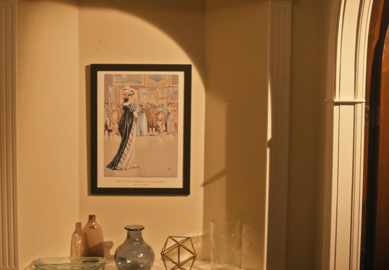 Susan didn’t make it to the fundraiser because her house apparently ate her. Also the picture in her hallway has changed to (probably a print of) Franรงois Courbin’s “Salon 1800” poster.